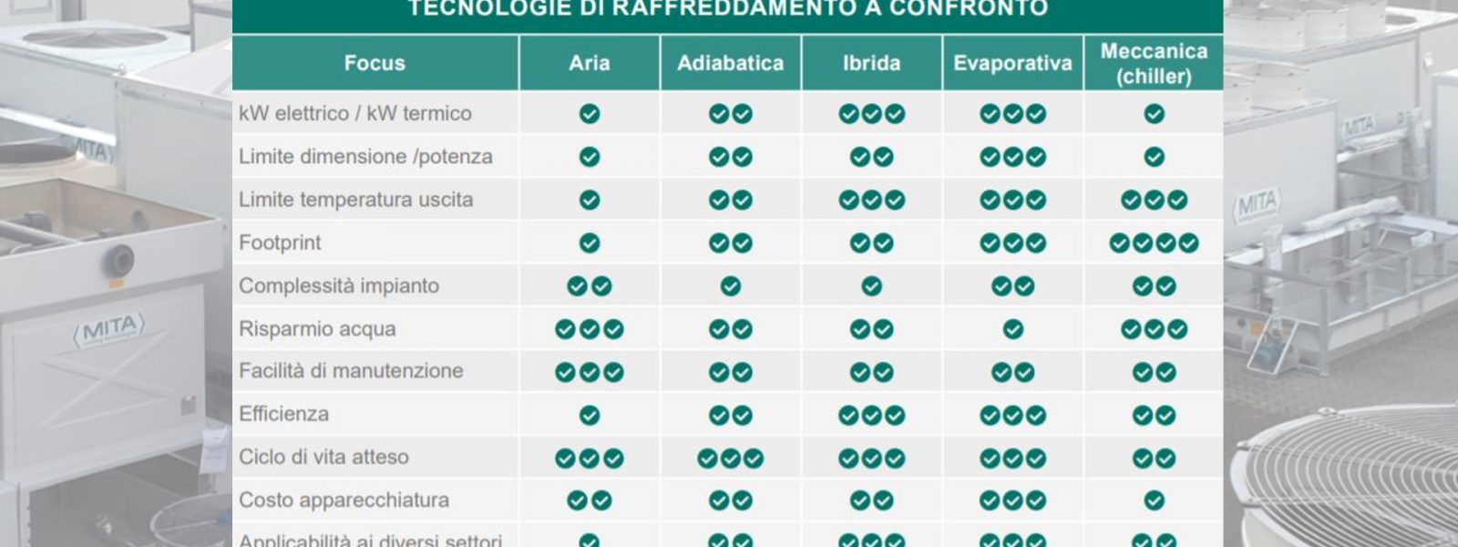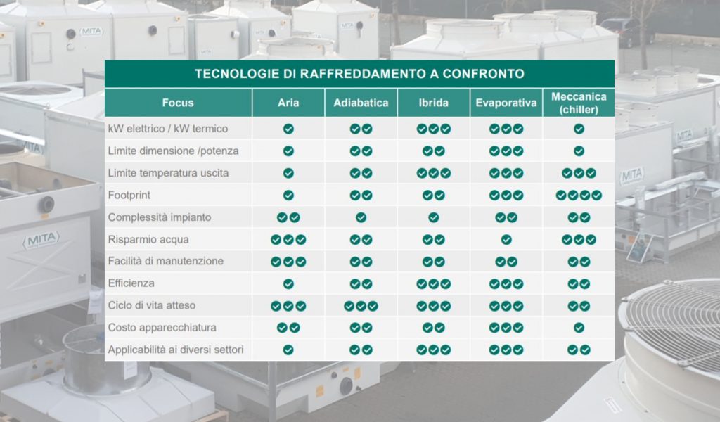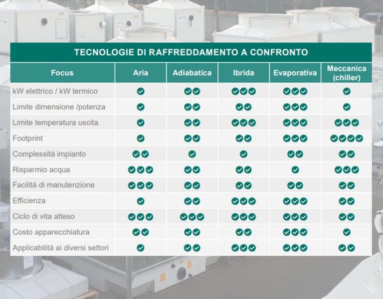 Non è solo retorica. Puoi vedere qui a fianco come ogni tecnologia di raffreddamento risponda a diverse situazioni impiantistiche. Oltre a permettere diverse temperature in output del fluido e diverse performance.